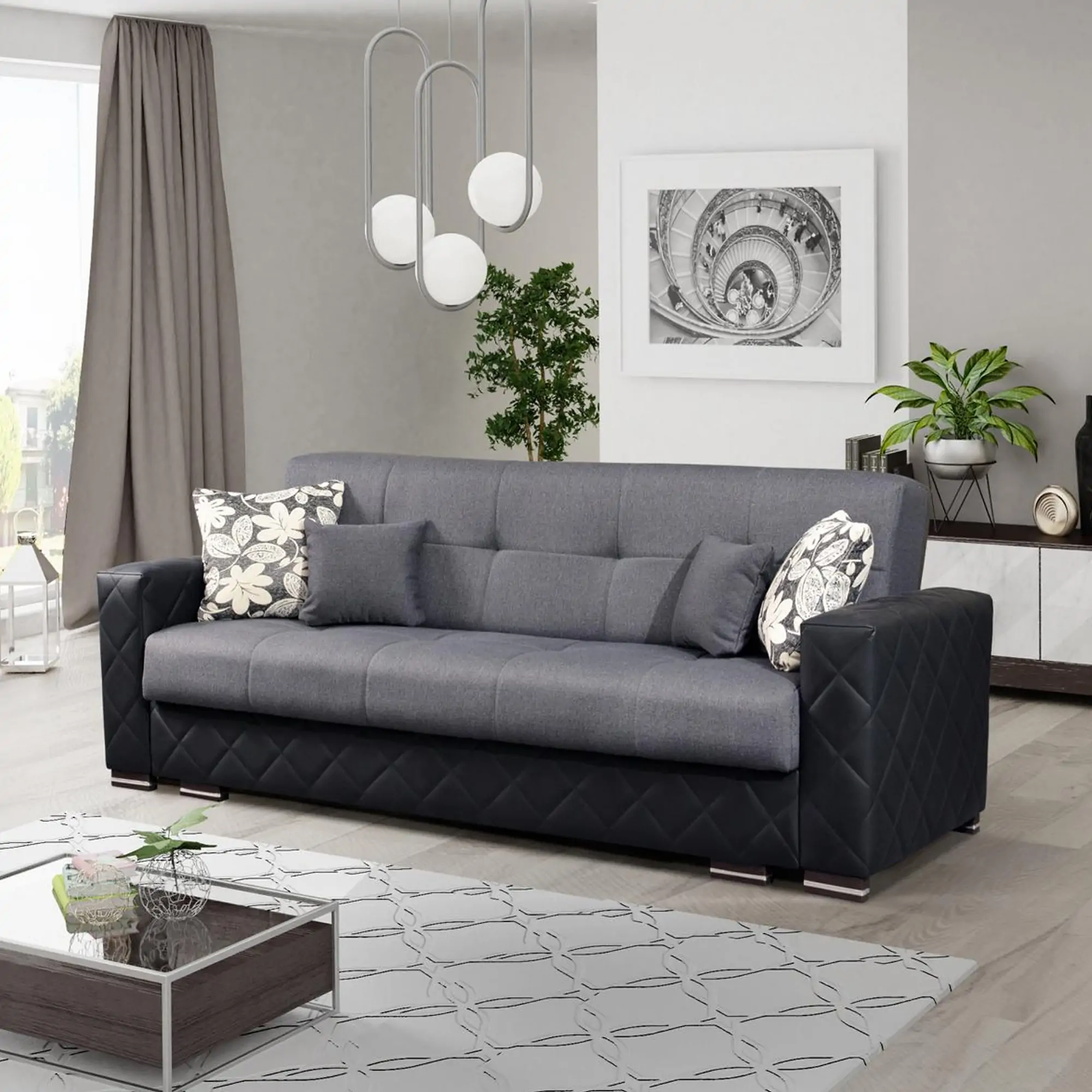 Chicago Sofa Bed has a successful combination of different details like woven leatherette sides, all-natural wooden armrests and chrome fee set the atmospheric dial for comfort and heightens the overall modern appearance. Twisting and bending resistant reinforced frame construction. Rust and corrosion resistant galvanized mechanism and fitting parts.