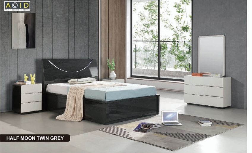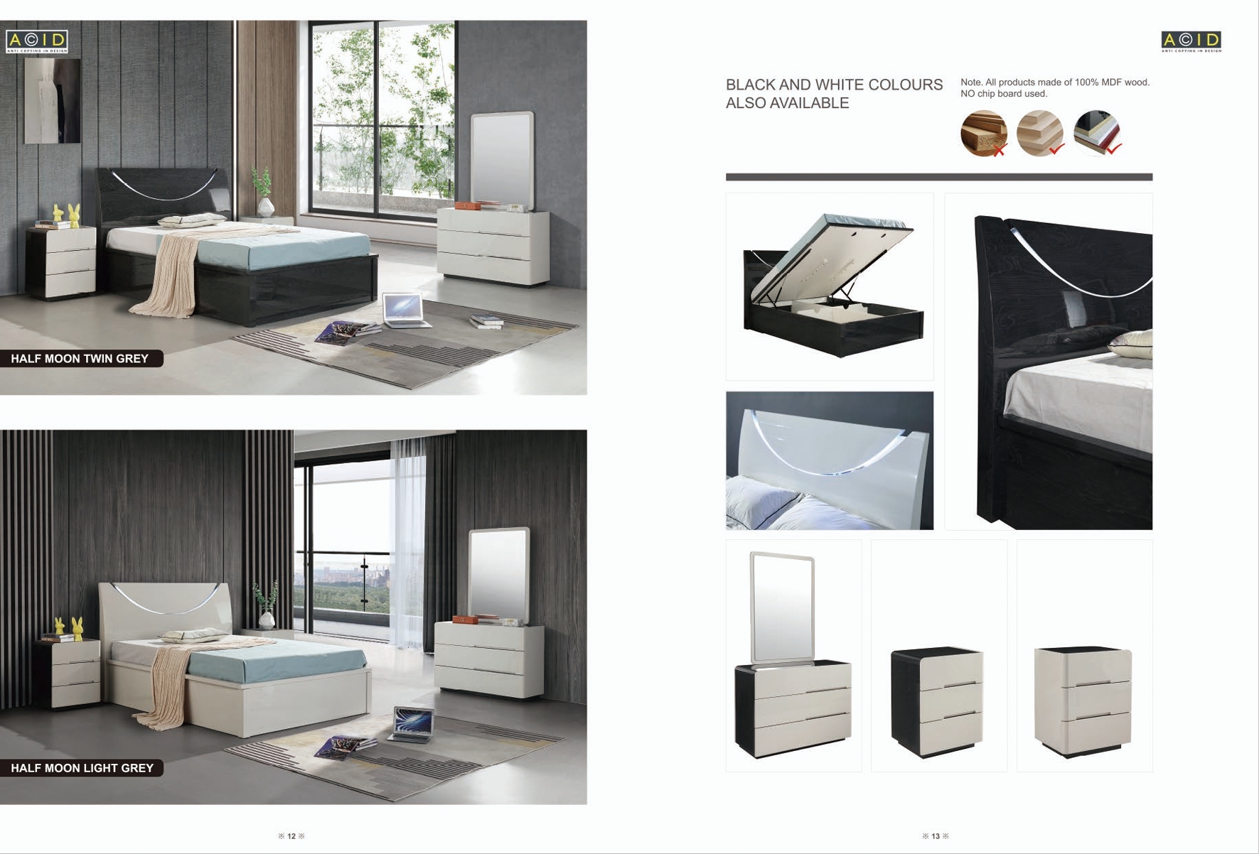 This Half Moon High Gloss Bedroom Set is the perfect addition to any bedroom. The set includes a bed frame made of wood or 100% MDF wood .The set is available in Cream,Grey and twin grey  black, and cream colours, making it a versatile option for any decor.The bedroom set is designed for adults and is suitable for any bedroom room. The glossy finish adds a touch of elegance to the set, making it a great addition to any home. The set is made of high-quality materials, ensuring durability and longevity. THE bedroom set includes: 1 x  storage Led  BED 2 x Nightstands 1x Dressing Table 1 x Wardrobe 180 cm wide