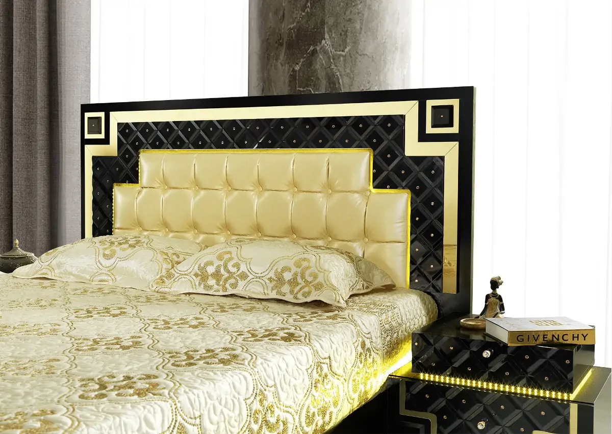 A range of baroque style furniture combining elegance and chic for your bedroom, living room, dining room, sofa, and even your TV area. This bedroom will surprise you with its brilliant diamond-shaped design adorned with rhinestones subtly framed with mirror-effect bands. Matched with LED lighting, the large storage bed (box springs included) offers an optimal comfort and a glamorous atmosphere. The led bedside tables perfectly complement the charm of the padded headboard surrounded by a mirror effect decor. The led dressing table with its large mirror and these drawers specially designed to store all your personal effects. Optimize your storage with the large sliding wardrobe, worthy of a walk-in closet with these drawers, wardrobes, and numerous storage spaces. The refined baroque style of this range of furniture will enhance your bedroom decor.