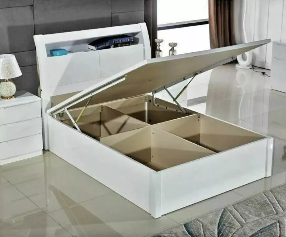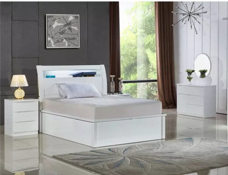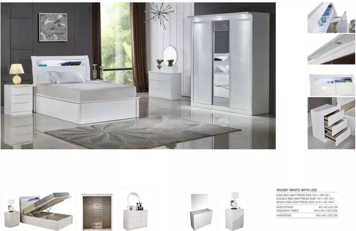 This Rugby High Gloss Bedroom Set is the perfect addition to any bedroom. The set includes a bed frame made of wood or 100% MDF wood, and a double-sized mattress. The set is available in white, walnut, black, and cream colours, making it a versatile option for any decor.The bedroom set is designed for adults and is suitable for any bedroom room. The glossy finish adds a touch of elegance to the set, making it a great addition to any home. The set is made of high-quality materials, ensuring durability and longevity. THE bedroom set includes: 1 x  storage Led  BED 2 x Nightstands 1x Dressing Table 1 x Wardrobe 184 cm wide